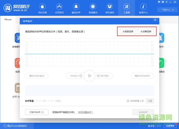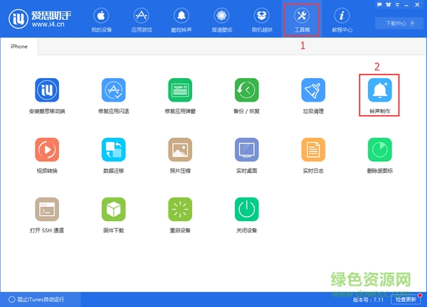 一、打开爱思助手,将移动设备连接到电脑,点“工具箱-铃声制作”进入铃声制作界面;