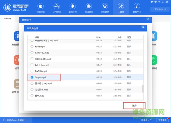 二、点“从电脑选择”或“从设备选择”,选择需要制作成铃声的音乐;
