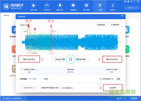 三、在试听时点“播放点设为起点”和“播放点设为终点”或 拖动起点和终点来确定铃声的区间,之后点击“生成铃声”来制作铃声;