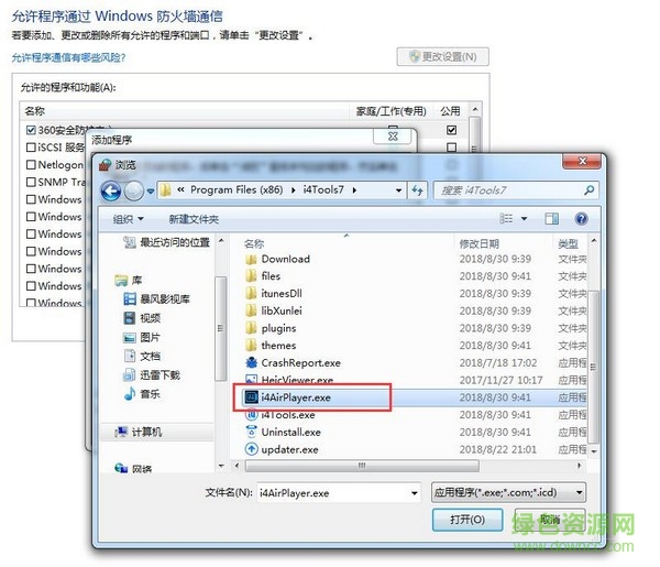 5、若列表中找不到【爱思助手AirPlayer投屏工具】,点击【允许运行另一程序】路径浏览找到爱思助手客户端安装目录添加【i4AirPlayer.exe】,添加完以后重新连接即可;