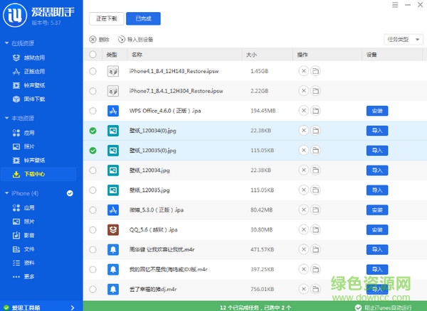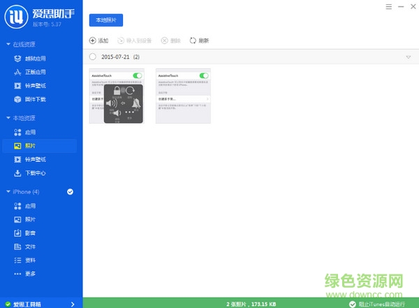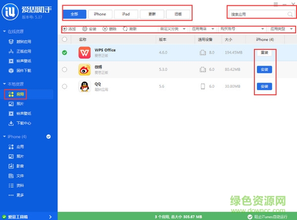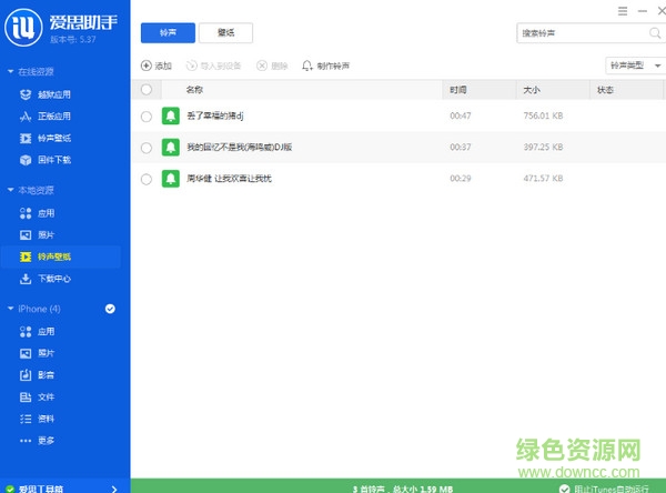1、首先在本站下载爱思助手软件后,然后安装到电脑上,打开进入软件主界面,如下图所示,在界面左侧有在线资源、本地资源两类,在线资源指的是你可以通过该软件获取网络上的正版应用、铃声壁纸等。
