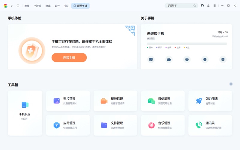 360手机助手电脑版2023是专为android智能手机打造的pc端资源管理工具。提供海量的游戏、软件、音乐、小说、视频、图片,通过它轻松下载、安装、管理手机资源。所有提供信息资源,全部经过360安全检测中心的审核认证,绿色无毒,安全无忧。赶快来下载360手机助手电脑版吧!