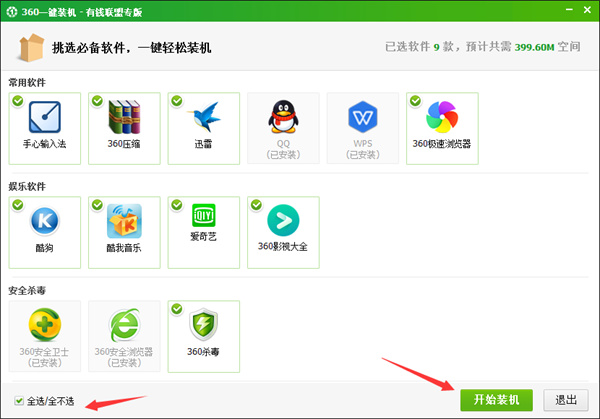 装机集合包包括:360安全卫士、360杀毒、360安全浏览器、酷我音乐、360压缩、手心输入法、迅雷、QQ、酷狗音乐、360极速浏览器、爱奇艺等。