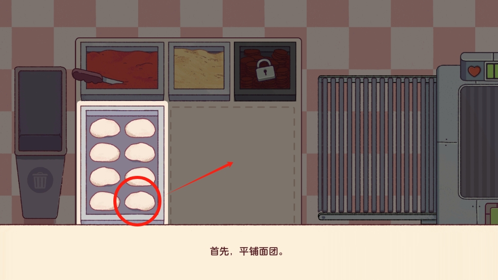 2、进入厨房后就可以制作披萨了,首先我们先选择一个面团平铺;