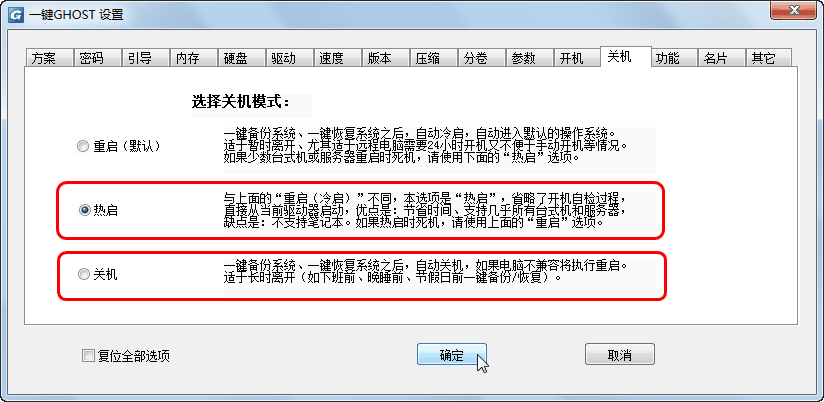 增设关机->热启,解决少数电脑重启时死机问题