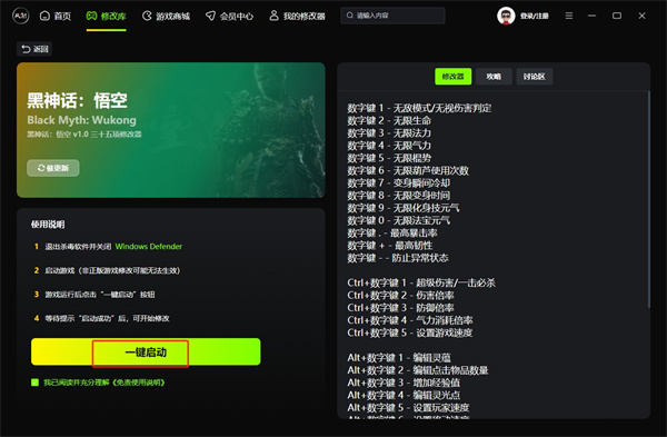 5、最后只需要在页面中点击【一键启动】就可以在游戏中使用修改器内容;