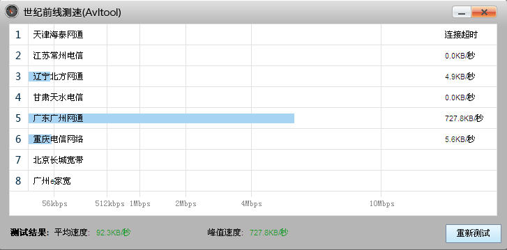 avltool网络测试工具工具使用简单,点击【开始测试】按钮就可以。可以通过 FTP 协议,测试出连接8种不同提供商服务器的速度。测试数据全部在内存中进行,不会向磁盘写入文件。X 轴的显示单位是比特率,不要把它当成下载速度。需要的朋友赶紧来绿色资源网下载吧