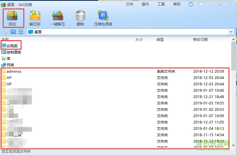 1.桌面上找到360压缩的快捷方式,鼠标左键双击打开,进入到软件主界面,如下图所示,我们选中自己要压缩的一个或者多个文件,选中后我们点击界面上方的添加进行下一步。
