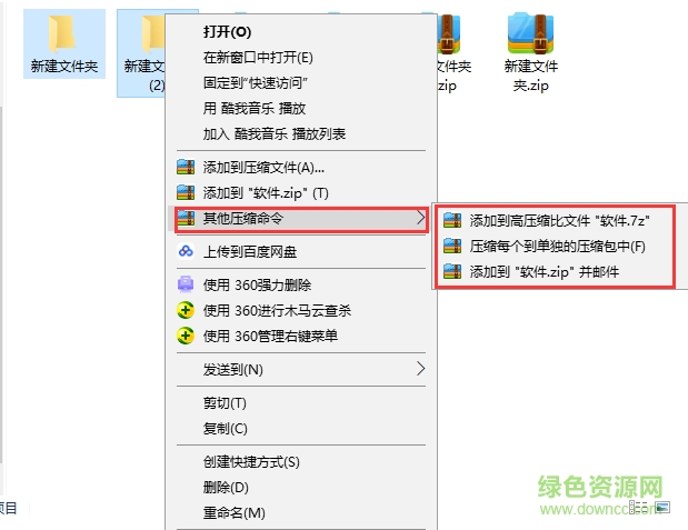 1.首先在绿色资源网下载安装好360压缩软件后,我们找到需要压缩的一个或者多个文件夹,选中后我们鼠标右键点击选中的文件,就会弹出菜单栏,如下图所示,在菜单栏中我们就可以看到有“添加到压缩文件”、“添加到xx.zip”以及其他压缩命令三个选项,一般我们常用的是前两个。