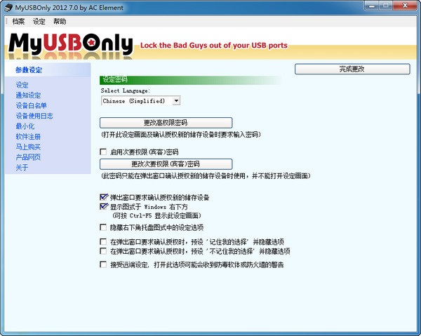 在系统托盘中MyUSBOnly图标的右键菜单中点击“设定”项,在弹出的MyUSBOnly登录窗口中输入密码(默认为“0000”),确定后即可打开MyUSBOnly管理窗口。