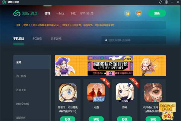 网易云游戏,你领略游戏新时代!为您提供优质的云游戏技术服务和服务器资源,畅快体验海量手游和PC游戏。在网易云游戏平台上,无论是大型端游,还是热门手游,玩家们都不用安装,打开网页点击就玩,没有下载安装的困扰,玩家在短时间内就可以尝试到多款精品游戏,极大地降低了玩家的体验成本,安心又省力。