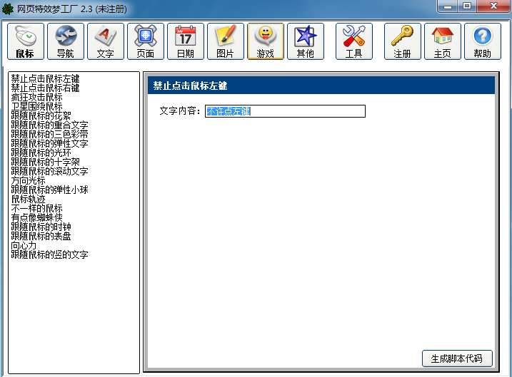 网页特效梦工厂是一款专业的网页特效代码生成工具。软件可以自动生成网页特效代码,你还可以进行参数自定义设置。软件功能强大,支持添加文字特效、图片特效、时间日期特效、页面特效等。有了它,可以帮你制作出更美观的网页,赶快下载体验吧!
