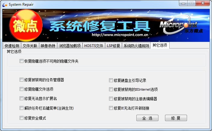 微点系统修复工具是一款绿色免费的系统修复软件,该软件功能强大,简单易用,占用内存小,能修复一些系统常见问题,包括文件关联、修改host文件、修复ie不能打开等问题,喜欢的用户就下载吧。
