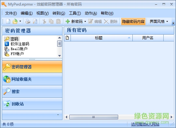 效能密码管理器是一款功能强大的密码管理器,这款软件能够帮助用户轻松管理自己的密码,让你的密码更轻松有效,有需要用到这款软件的朋友就赶快来绿色资源网下载使用吧!