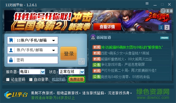 成功注册完11平台账号后,请选择正确的登陆服务器。目前11对战平台支持电信、网通、教育网登录。当然,您也可以使用通行证或游客登录。