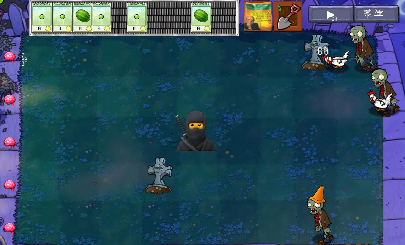 4、上方传送带中将会随机出现各种植物或者水果,点击水果扔向僵尸的位置忍者在消灭水果的同时也会消灭僵尸。
