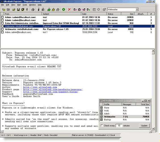Popcorn 是一个免费的POP3/SMTP电子邮件客户端工具,它可以直接从POP3服务器上接收邮件。它可以通过远程服务器来访问并删除文件。它支持多用户账户,无需安装。这个升级增强了一些功能以及作了漏洞修正。