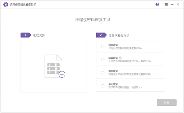 疯师傅压缩包解密助手官方版是一款有关压缩包解压解密的应用软件,界面设计十分简单,提供多种压缩包文件格式,还有四种不同的密码恢复模式,可以帮你快速解密恢复密码,轻松获取需要的文件资料,使用方便又安全!