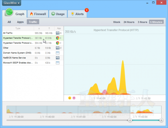 第一步:安装好并开啟 GlassWire 软体,可以在「Graph」分页看到目前电脑的即时流量高低(网路频宽使用),预设以黄色表示下载流量、粉红色代表上传流量。另外,也可点选单一应用程式,检视该应用程式的即时流量画面。