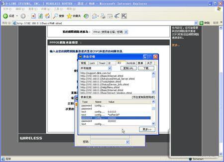 如果页面针对星号进行了加密的话,我们需要点该软件的扩展高级功能按钮,然后切换到IE或IE2标签,软件会进一步分析页面,然后我们在下面的表单元素中就可以看到星号对应的明文信息了,笔者就通过这个软件成功的还原恢复出了D-LINK路由器中保存的拨号帐户以及对应的星号密码明文信息。这个小工具笔者也以附件的形式为各位读者送上。