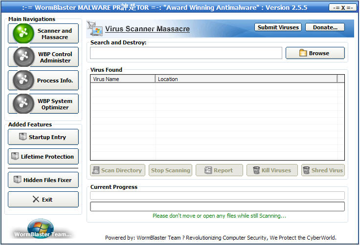 提起蠕虫病毒,可能部分朋友还不是很了解,曾经流行的“熊猫烧香”病毒以及其变种,目前正在流行的“超级工厂”病毒等等,都属于蠕虫病毒。与传统病毒的差别是,蠕虫病毒可通过更为广泛的方式,比如说它可以自动的扫描在同一个局域网内其他的电脑有没有漏洞,然后将病毒发送过去植入到那台电脑或者通过USB的使用或者是邮件,因此危害性极大。今天为大家带来的是一款来自国外的蠕虫病毒专杀工具WormBlaster,可以帮助用户轻松检测并清除包括病毒、蠕虫、木马等种类的恶意程序,协助杀毒软件共同保护用户的系统安全!