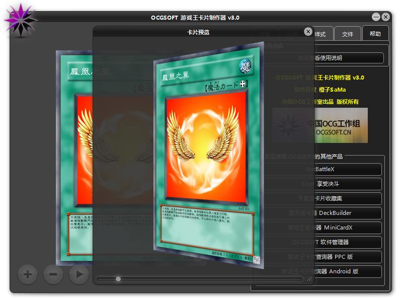 OCGSOFT游戏王卡片制作器是中国OCG工作组的又一力作。它可以让玩家简单、轻松的制作出自己的卡片,并用于打印。这是第三代的卡片制作器,与第二代相比,它使用了全新的3D界面引擎,并且对各种操作都做了优化,整体体验上比第二代好了很多。