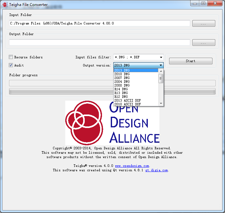 Teigha文件转换器是一个免费的dwg和.dxf文件转换工具。具有多功能的图形版本转换功能。该应用程序提供了一个图形界面和命令行界面,在执行时,该应用程序标识的指定源目录相匹配指定过滤器的所有文件,然后加载和保存每个文件的输出而指定目录中指定的输出版本/类型。如果审核标志被启用时,审计/修复操作将被应用到每个文件,因为它被加载。如果递归标志启用后,源目录中的子目录将被递归处理。