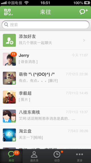 来往是阿里巴巴集团重磅推出的一款新一代好友互动平台,围绕手机通讯录建立您的熟人圈子。 它不仅仅是一个即时通讯聊天工具,您可以通过来往与好友进行快速的联系,安全私密的聊天,支持发送的内容包括文字、图片,完全免费的丰富贴图表情,以及地理位置等,与你的好友随时随地分享动态。