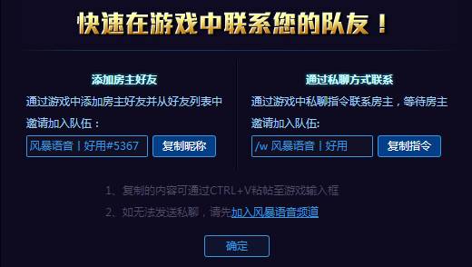 l点击私聊方式的“复制指令”按钮,复制指令后粘贴(CTRL+V)至游戏聊天输入框中并回车,即可与房主私聊;