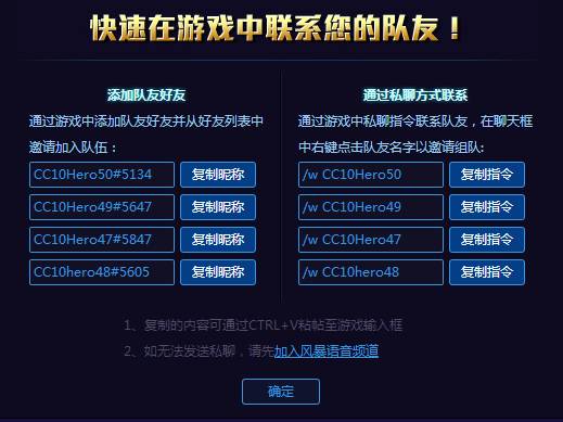 l点击私聊方式的“复制指令”按钮,复制指令后粘贴(CTRL+V)至游戏聊天输入框中并回车,即可与对应队员私聊;