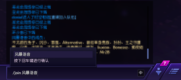 在游戏聊天中加入“风暴语音”频道(聊天输入框中输入指令’/join 风暴语音’并按回车发送)