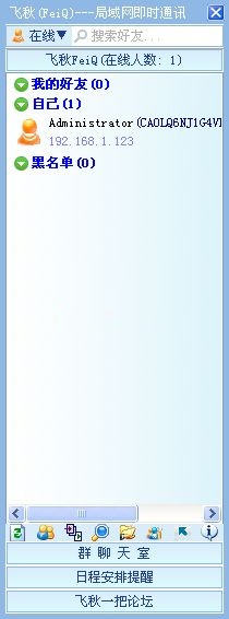 飞秋(FeiQ)是一款局域网聊天传送文件的绿色软件,支持语音,远程协助群聊天(不需要服务器)。软件借鉴了飞鸽传书(IPMSG)和qq, 完全兼容飞鸽传书(IPMSG)协议,具有局域网传送方便,速度快,操作简单的优点,同时具有QQ中的一些功能。