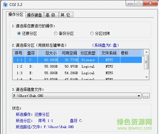 cgi一键还原软件是一款功能丰富的备份还原工具,适用于操作系统Windowsxp以上操作系统,支持还原分区、备份分区、分区对拷等功能,还具有强大的自定义功能,界面简约易用,需要的朋友快来下载吧!