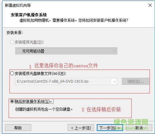 3.这里注意了,第一步:选择好刚刚你的centos7镜像文件位置 ,第二步:选择稍后安装操作系统