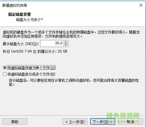 6.设置操作系统磁盘大小,磁盘存储方式自己选择就行(小编这里设置为30,单个文件),点击下一步