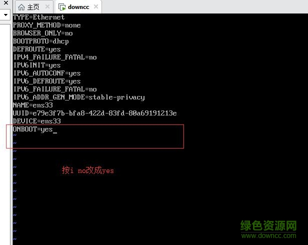 2.输入vi /etc/sysconfig/network-scripts/ifcfg-ens33 找到onboot改成yes,按下字母按键‘i’就能修改文件了,修改完成之后输入:wq然后按下enter键编辑成功