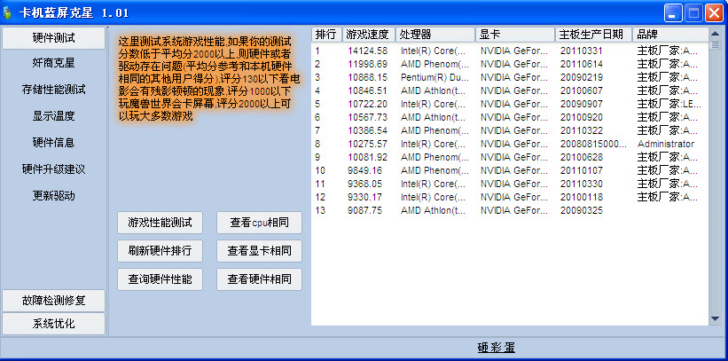 卡机蓝屏克星是由硬件检测大师更名而来的,是一款全知的硬件测试工具。了支持硬件评分外,还采用云计算技术把硬件排行榜细分化,详细列出每个硬件以及硬件组合的分数差异,更为优秀的是直接输入硬件型号就可以看到硬件评分,在云测试面前可以发现所有打磨过的cpu以及超频的伪造内存,正是奸商的克星,电脑diy爱好者的福音,同时内置死机克星功能,可以扫描硬盘坏道,扫描内存稳定性,可以知道系统有没有可能死机,究竟哪里引起的死机。