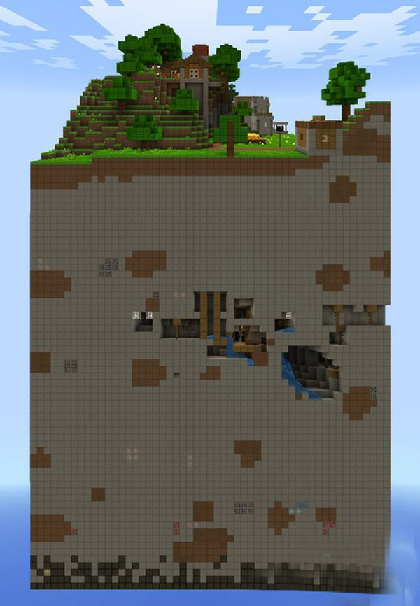 我的世界立体生存地图存档,地型水平面积小,怪物比较集中,垂直高度和常规地图一样下到基岩层.这样保持了地下探险的乐趣.关件在山体右边的山洞,提供了白天刷怪的条件,一但夜幕低垂,山洞中的怪物们有点像小规模入侵。天然一体的地下小世界,有两个地牢加废弃矿洞四通八达。