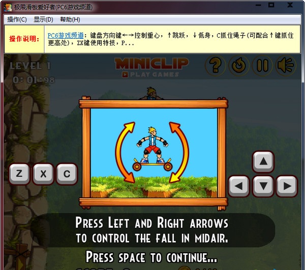 操作方法:键盘方向键←→控制重心,↑跳跃,↓低身,C抓住绳子(可配合↑键抓住更高处),ZX键使用特技,P暂停。