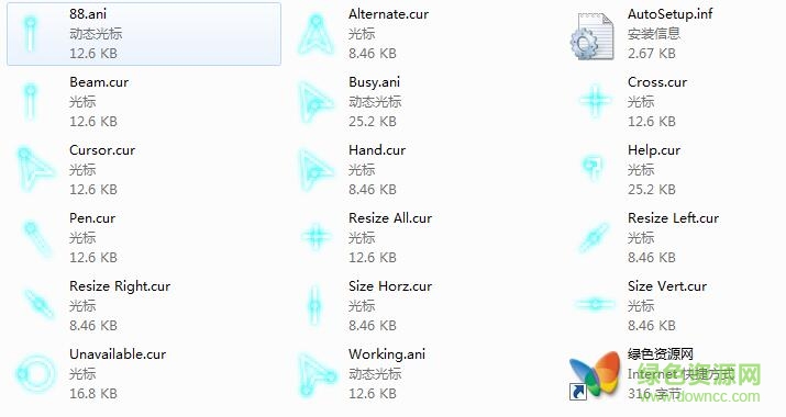 蓝色荧光鼠标指针:蓝色非常纯净,通常让人联想到海洋、天空、水、宇宙。纯净的蓝色表现出一种美丽、冷静。这款主题还有荧光的效果,相当的精美哦!喜欢的小伙伴快来绿色资源网下载吧。