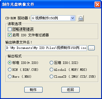 2.可以设定UltraISO的读取选项:忽略读取错误,启用ISO文件卷过滤器;指定输出映像文件名及路径。选择映像文件的输出格式,UltraISO支持多种输出格式,在这里选择标准ISO格式(*.iso)。点击“制作”按钮,进入ISO映像制作过程。