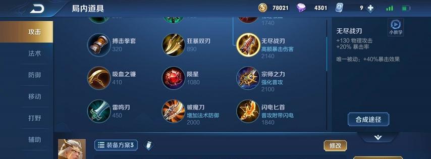 合理的装备选择是后羿发挥输出的重要保证。对于新版后羿,强调的是攻速和暴击伤害。在出装时,应优先选择提高攻速和增加暴击伤害的装备,如“破军”、“破魔刀”等。