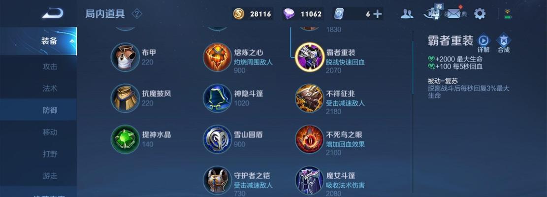 通过选择生命回复装备可以增加自身的生存能力,减少鲁班大师的攻击对自己的影响。推荐选择“不死鸟之眼”和“破魔之甲”,这些装备可以增加自己的生命值和魔法抗性。