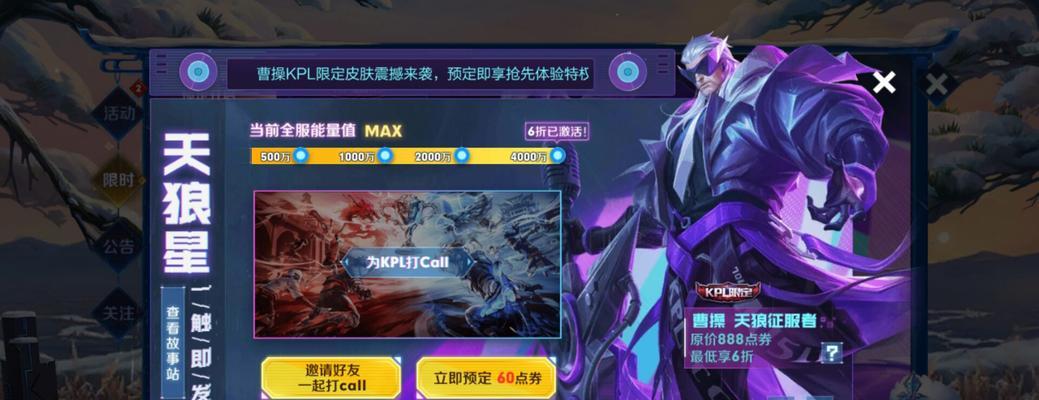 《王者荣耀》一直是国内最受欢迎的手机游戏之一,近日发布了全新皮肤KPL天狼征服者,想必吸引了大量玩家的关注。本文将为大家介绍如何预订KPL天狼征服者,以及预订时需要注意的事项。