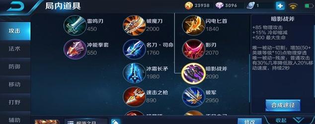 在选择装备时,我们首先要考虑到杨戬的输出和生存能力。对于输出方面,我们可以选择“破军”、“闪电匕首”等装备,来增加他的爆发输出。而对于生存能力,我们可以选择“不祥征兆”、“魔女斗篷”等装备,来增加他的生存能力。