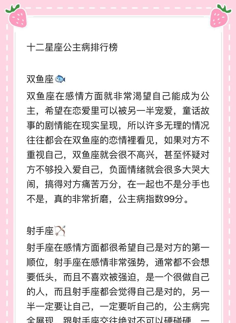 你是否曾经有过一种渴望被宠爱、呵护和崇拜的感觉?公主病或许就是你内心深处的一种渴望。然而,与公主病相伴而来的常常是烦恼和困惑。本文将以《以我有公主病攻略》为主题,为你揭示公主病的真相,并给出实用的解决方案,帮助你成为你心中真正的公主。