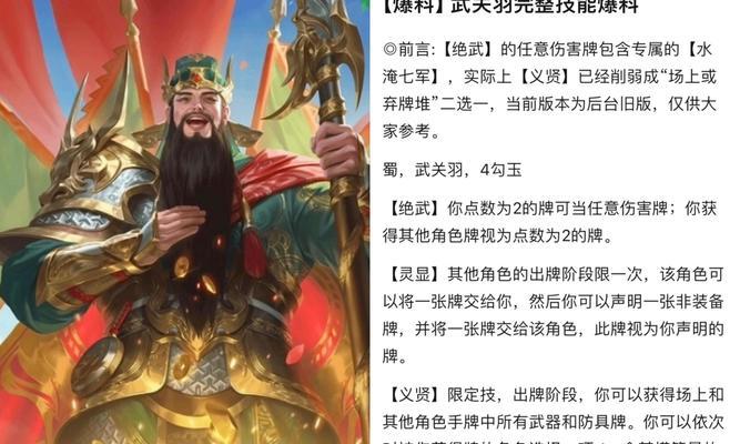 作为三国演义中备受崇敬的武将,关羽以其忠诚、勇猛的形象深入人心。在王者荣耀游戏中,关羽同样是一位备受玩家喜爱的英雄。他强大的输出和生存能力使得他成为团队中的核心角色之一。然而,要想发挥出关羽的最大潜力,合理的出装铭文和正确的操作技巧是必不可少的。本文将带您揭秘关羽的最佳出装和铭文搭配,并提供一些教学攻略,助您成为无敌武将!