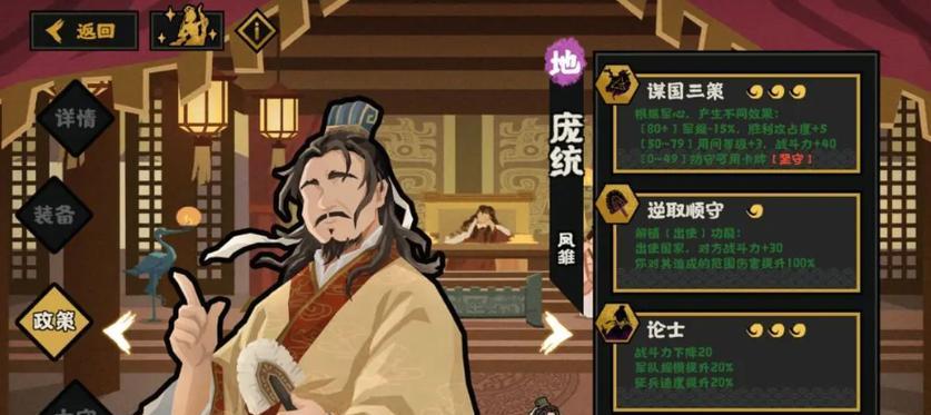 庞统拥有强大的谋略和技能,在战斗中可能会给你造成一定的困扰。为了提高战斗胜算,你需要学会配合你的角色技能,制定合理的战术。