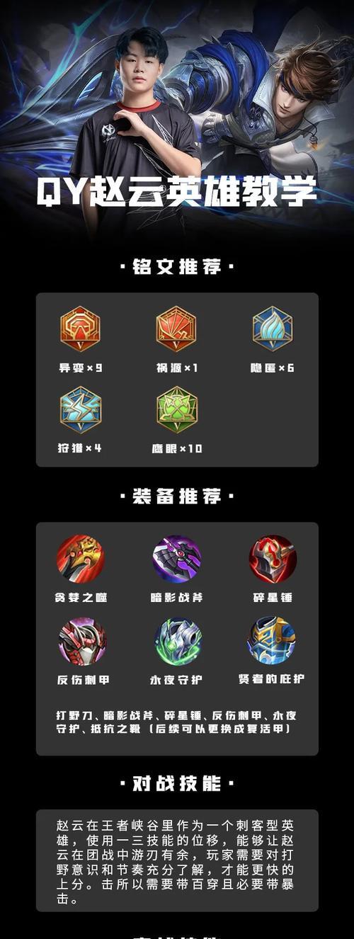 赵云作为王者荣耀中的强力战士英雄,其在巅峰赛中的出装和技巧能够发挥出最大的优势,成为战场上的一股不可忽视的力量。本文将为大家详细介绍巅峰赛赵云出装攻略,帮助玩家更好地驾驭这位无敌剑客,横扫敌阵,赢得胜利。