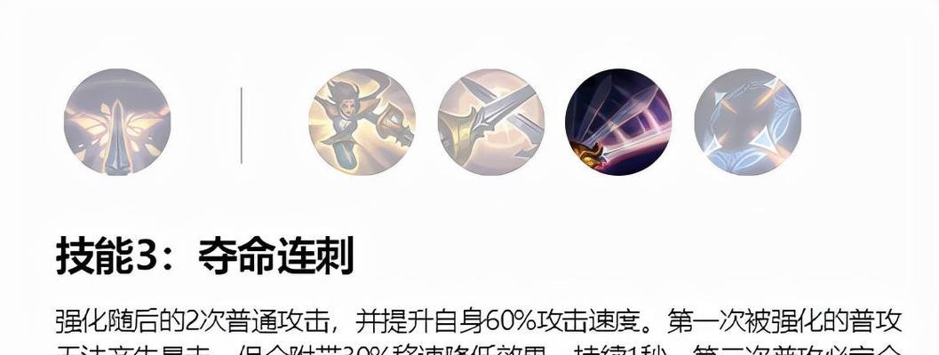 在技能升级上,剑姬的1技能“剑刃风暴”是最主要的输出技能,因此应优先进行升级。其次是2技能“回旋斩”,最后是大招“瞬华”。